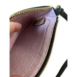 -Description: Dooney & Bourke Pebble Grain slim wristlet in black leather. In beautiful condition! Beautiful pink material inside. Numbered: J8040736