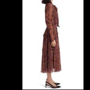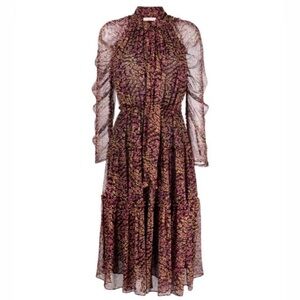 The Idalia Dress in Pomergranate is an elegant midi dress with tiered hem, long sleeves, and a bow neckline. The tiered hem and long sleeves create a flattering silhouette, and the midi length is perfect for formal occasions