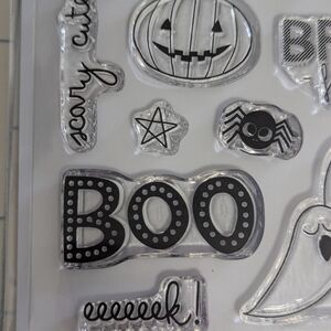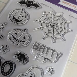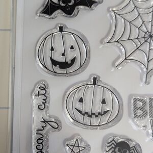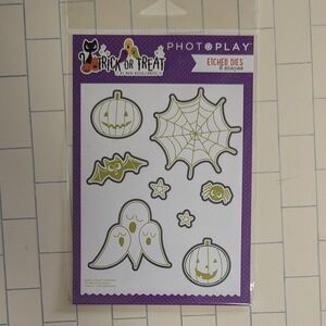 This set of Halloween-themed photopolymer stamps and etched dies features pumpkins, bats, spider webs, and ghosts. Perfect for crafting, card making, and scrapbooking.