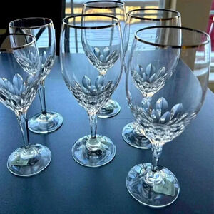 Gorham full lead crystal stemware, made in Germany. New with Tags on all but one of the smaller ones. Platinum rimmed. Simply gorgeous! 4 are iced tea glasses and 2 are smaller water or wine glasses.