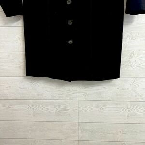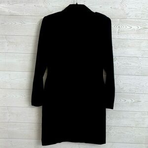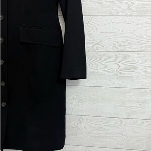 Black polyester/rayon blend midi jacket with down front, 2 front slap slip pockets, button tab on shoulders and satin lining. Size 8 S2S 16” P2P 18” L 36” SL 24” Like new condition. See pictures for details and normal wear and tear.