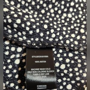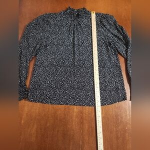 Office or casual wear black blouse with white dots. Features a high neckline and long sleeves. Gently used. Approximate measurements are in the photos.