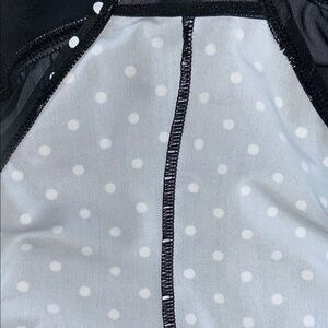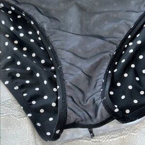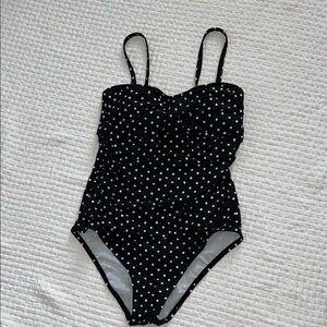 Stylish black one-piece with white polka dots. Features adjustable straps. Perfect for a chic beach look. Never used