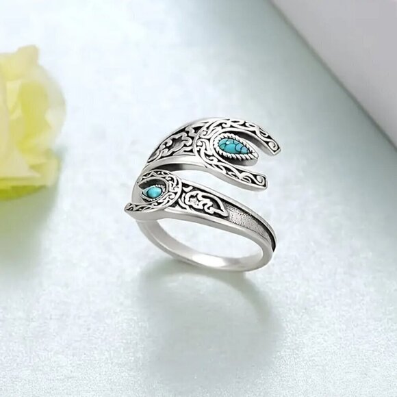 Boho Horseshoe and Faux Turquoise Adjustable Spoon Ring #1358