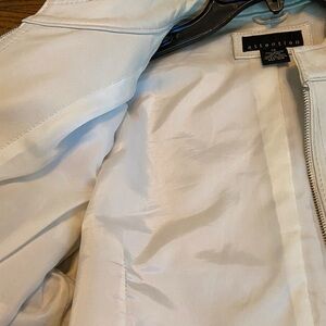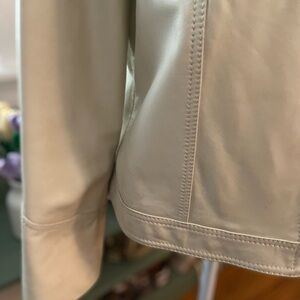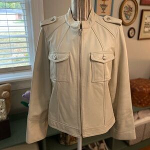 Chic genuine leather cream colored utility jacket with buttoned pockets. Stylish shoulder epaulettes. Perfect for layering. Excellent condition. Non smoking home. Silver tone hardware and full zip front. Bust measures approx 18 inches across and length is approx 21.5 inches