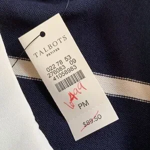 Talbots size MP navy blue and white striped cotton sweater. Removable collar. 3/4 sleeves. Super soft. NWT.