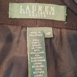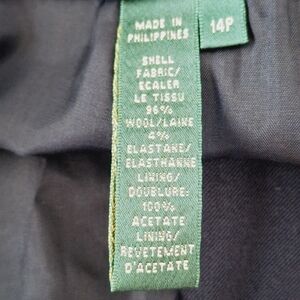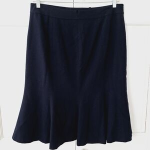 Dark blue Lauren Ralph Lauren wool skirt. Front button and zipper close. Flared bottom hem. Fully lined.