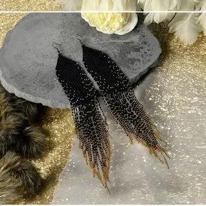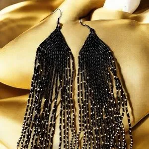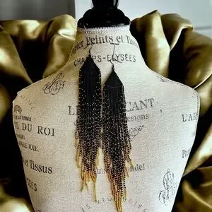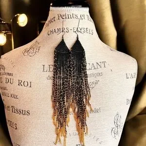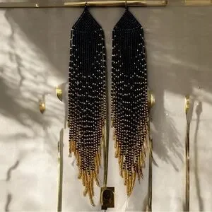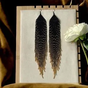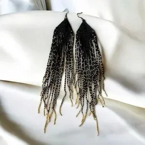 These striking earrings feature a dramatic cascade design with black and gold glass hand beaded strands that create a long, flowing fringe effect. Gold-toned glass and metal accents at the add a contrasting metallic element, enhancing the elegant pointed tip. The combination of black beads and gold details makes these earrings a bold statement piece. Sexy and flowing. A little over 9” long.