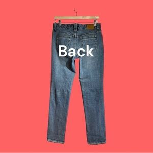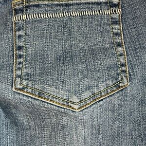 Medium faded blue jeans 98% cotton/2% Spandex, 5 pockets and hemmed legs with decorative stitching. Embroidered logo inside waist, belt loops. Leather logo badge slightly detached. Made in Hong Kong. Very good condition.