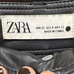 Stylish black faux leather pants with wide-leg design. Features front pockets and button closure.