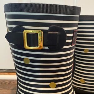 Joules Women's Size US 8 Molly Welly Mid Rain Boot Navy Blue and White Stripe with Gold Polka Dots.
