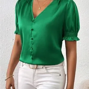 Elegant Green Women's Satin Puff Sleeve Front button Top