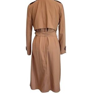 Stylish tan trench coat. Features a classic design. Belted waist for a tailored fit. Perfect for any occasion.