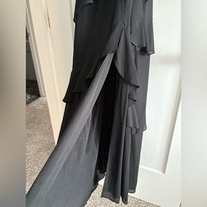 Lulus elegant black dress with cascading ruffles and slit down the front side. Lined, comfortable and perfect for elegant occasions. Smoke free home! Like new!