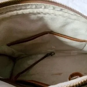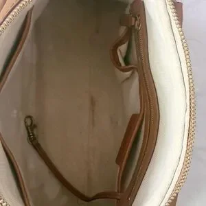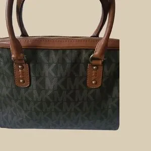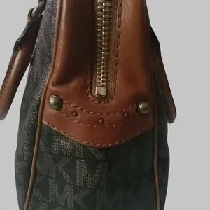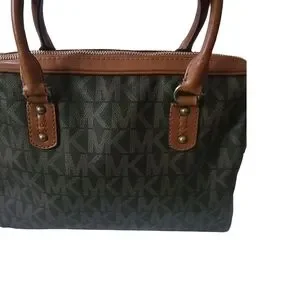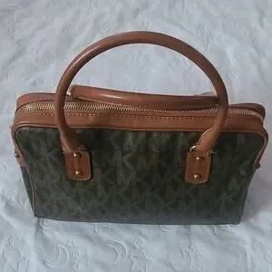 Elegant Michael Kors handbag with tan and brown interior. Features zip pockets and key clasp.