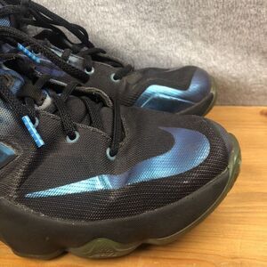 The Nike LeBron 13 XIII in boy's size 6.5Y is a sneaker featuring a 'Summit Lake Hornets' theme, inspired by LeBron James. The shoe is designed with a blue galaxy pattern and accented with eyelets, suitable for casual wear during the summer, fall, or spring seasons. It offers moderate cushioning with arch support and breathability, making it comfortable for activities like walking, school, basketball, and running. The synthetic upper material and rubber outsole provide durability, while the foam insole ensures a cushioned feel for active teens.