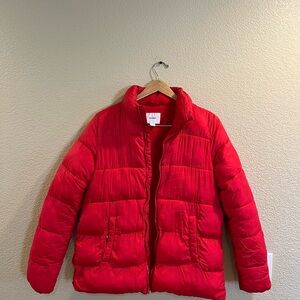 Vibrant red puffer. Cozy and stylish. Ideal for cold weather.