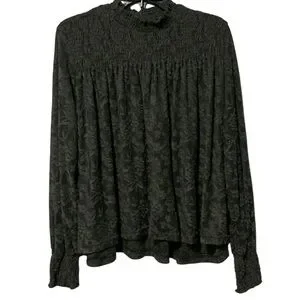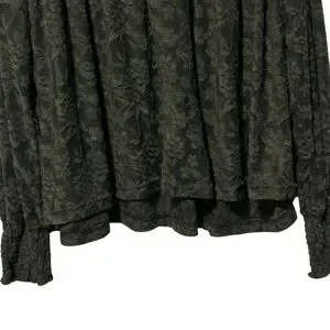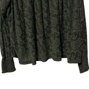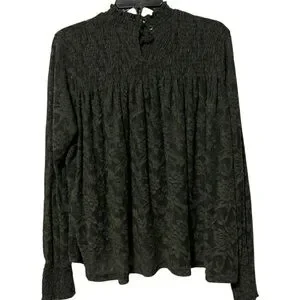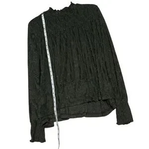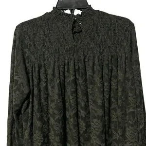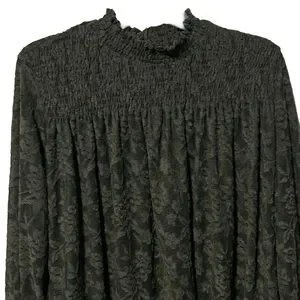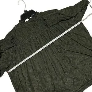 Size: M, Color: Olive Green, Lace Fabric, Mock Neck, Smocked Neckline, Long Sleeves w/Smocked Cuffs, Semi-Sheer, Swing/Babydoll Silhouette, Keyhole w/Double Button Closure (Back), 100% Polyester, Excellent Pre-Owned Condition, Extra Button Included *No size tag; I believe this is a M but I'm not 100% sure; Please see measurements-Selling As Is