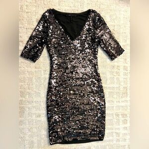 Elevate your evening look with this BCBGMaxAzria dress, featuring a shimmering black sequin design. The bodycon silhouette and v-neckline create a flattering fit, while the 3/4 sleeves add a touch of elegance. Perfect for cocktail parties, this midi dress exudes sophistication and glamour.