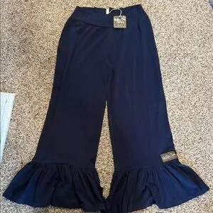Chic dark blue pants with playful ruffles. Ideal for casual wear.
