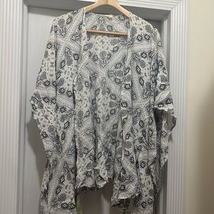 Stylish kimono coverup with a paisley print. Features a blend of black and white colors.