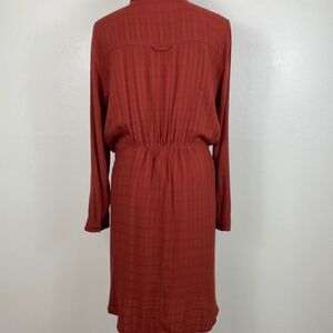 Maeve Bloomsbury shirt dress from Anthropologie in rich rust red. Long sleeves with collar and partial button front (buttons 1/4 down). Features tie-front detail and high-low hem with longer back. Excellent used condition. Size 8.