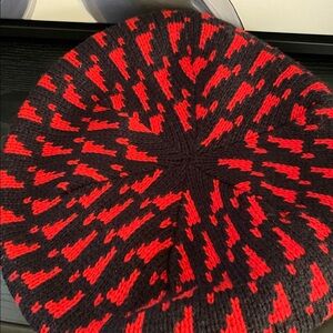 Elegant knit beret and gloves set. Striking red and black design. Perfect for fashion-forward looks.