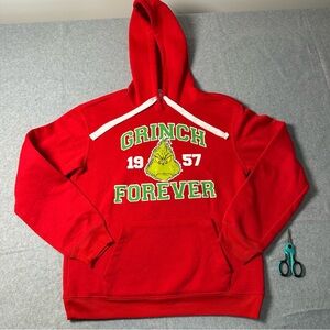 Bold red hoodie with festive Grinch Christmas graphic. Features 'Grinch Forever' text. Comfortable and stylish.