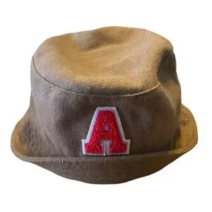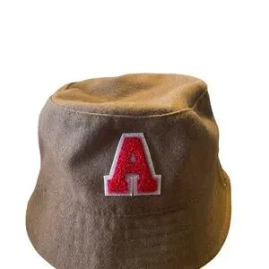Flannel brown hat featuring a bold red letter A. Bucket style with adjustable drawstring inside Perfect for adding a fun touch to any outfit.