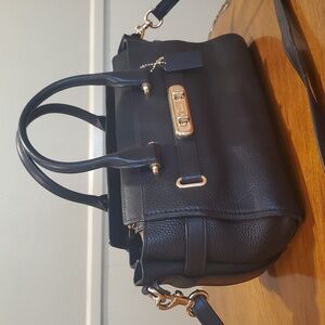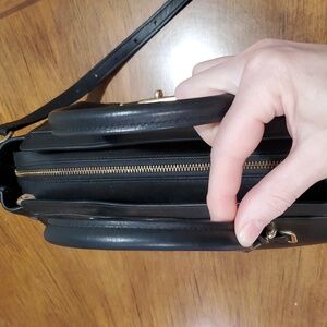 Black pebbled leather with gold hardware. I think its a Swagger 27. Length measured along the bottom. Shoulder strap is adjustable and removable. Bag is in excellent condition with minimal wear. Interior is very clean but has a light sweet perfume scent.