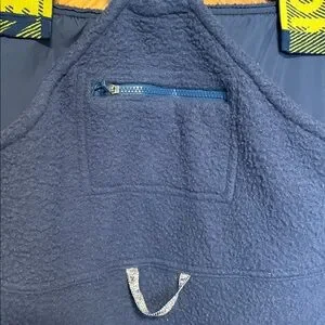 Cozy navy blue fleece overalls featuring adjustable straps and multiple zippered pockets.