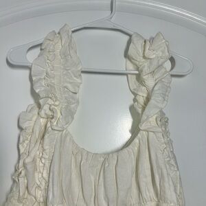 This chic white blouse from Abercrombie & Fitch showcases a ruched square neckline and a flattering peplum silhouette. The ruffled details add a romantic touch, while the airy fabric ensures a comfortable fit. Ideal for a stylish, summery ensemble.