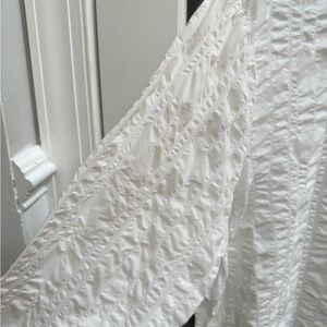 Elegant white blouse with textured design. Long sleeves and button-up front. Perfect for any occasion.