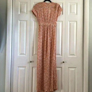 EUC. No stains or homes. Cap sleeve, wrap dress. Lovely color, with white and black flowers. Adjustable waists closure.