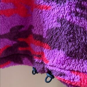Cozy fleece top with a vibrant purple and red camo pattern. Features a half-zip front and high collar. Perfect for active wear.