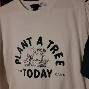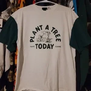 Eco-friendly graphic t-shirt with a 'Plant a Tree Today' design. Features green sleeves and a white body for a stylish look.