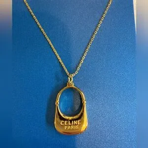 Gold bag-shaped Celine pendant. This is an upcycled charm and comes on an 18k gold plated unbranded chain, 18”.