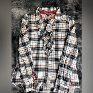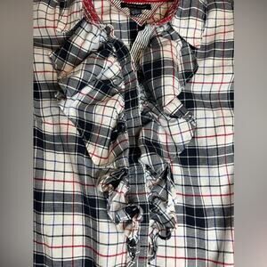 Tommy Hilfiger Plaid Flannel Ruffle Front Blouse Red, Navy, White Sz Medium