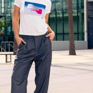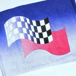 It’s a short-sleeved, fitted, cropped-style tee with a graphic print featuring a wavy checkered flag design in shades of blue, pink, and black. The shirt color is listed as "Marshmallow", which is a soft off-white or creamy tone