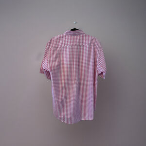 This Brooks Brothers men's dress shirt in size Large features a subtle pink and white gingham check pattern, made from 100% supima cotton for a comfortable and breathable fit. The short sleeves, collared neckline, and button closure make it a classic and stylish choice for any business or preppy setting. The spread collar and barrel cuff add a sophisticated touch, while the non-iron, easy-care, and wrinkle-resistant features ensure low maintenance and durability. Perfect for all seasons, this shirt embodies timeless style and practicality.