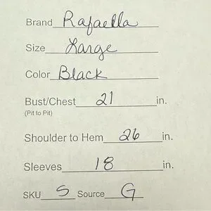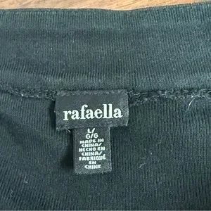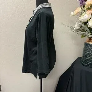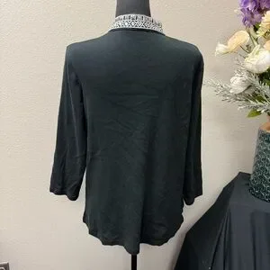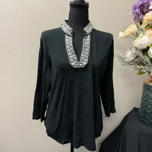 Elegant Rafaella black embellished tunic top in women’s size Large. Features a sparkling beaded neckline, split V-neck detail, and 3/4 sleeves for a sophisticated, easy-to-style look. Soft stretch knit fabric ensures comfort and polish. Perfect for holiday parties, dinner dates, or office wear—timeless and classy.