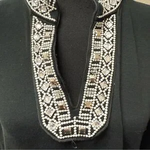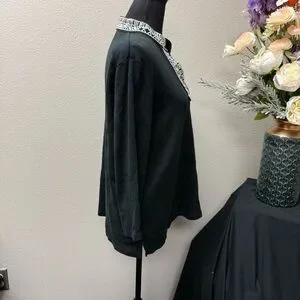 Rafaella Black Beaded Split Neck Tunic Top L Embellished 3/4 Sleeve Blouse