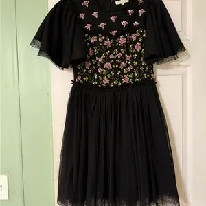 Adorable black dress with beautiful floral sparkly accents. Flutter sleeves.