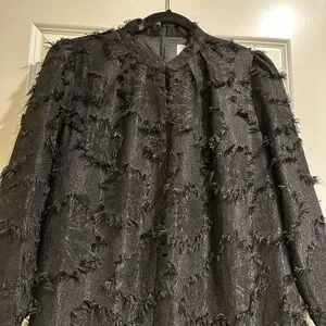 Dress is made of a feathered shimmery material. It features a Mandarin collar, bishop sleeves, and three lower tiers.