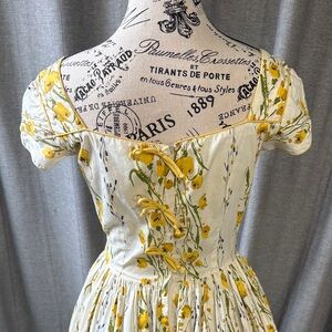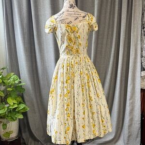 Vintage Jerry Gilden floral midi dress. Cream with vibrant yellow floral pattern. Back zipper with three delicate bows for decoration. This is a vintage garment, it does have some standard wear due to age, but nothing obvious. Waist is 26” max, no give.
