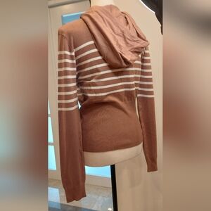 Stylish Guess hoodie with tan and white pattern. Features a front zipper and adjustable drawstrings.