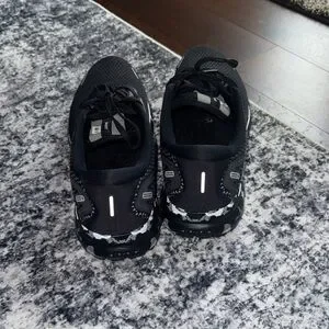 Stylish black athletic shoes with white accents. Perfect for running or casual wear.
