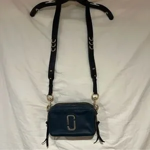 Stylish Marc Jacobs crossbody bag in dark blue. Features elegant gold hardware. Perfect for any outfit.
