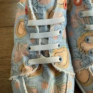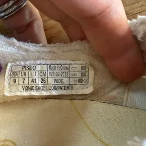 Charming VIONIC slip-on sneakers with a pastel floral pattern. Super fun color. Shoe has a worn look and is washable! Rubber on side is clean. Sole shows some wear. No tie laces. Comfortable and stylish for everyday wear.