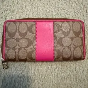 Elegant Coach wallet with signature pattern. Features brown and pink design. Ideal for organizing essentials.